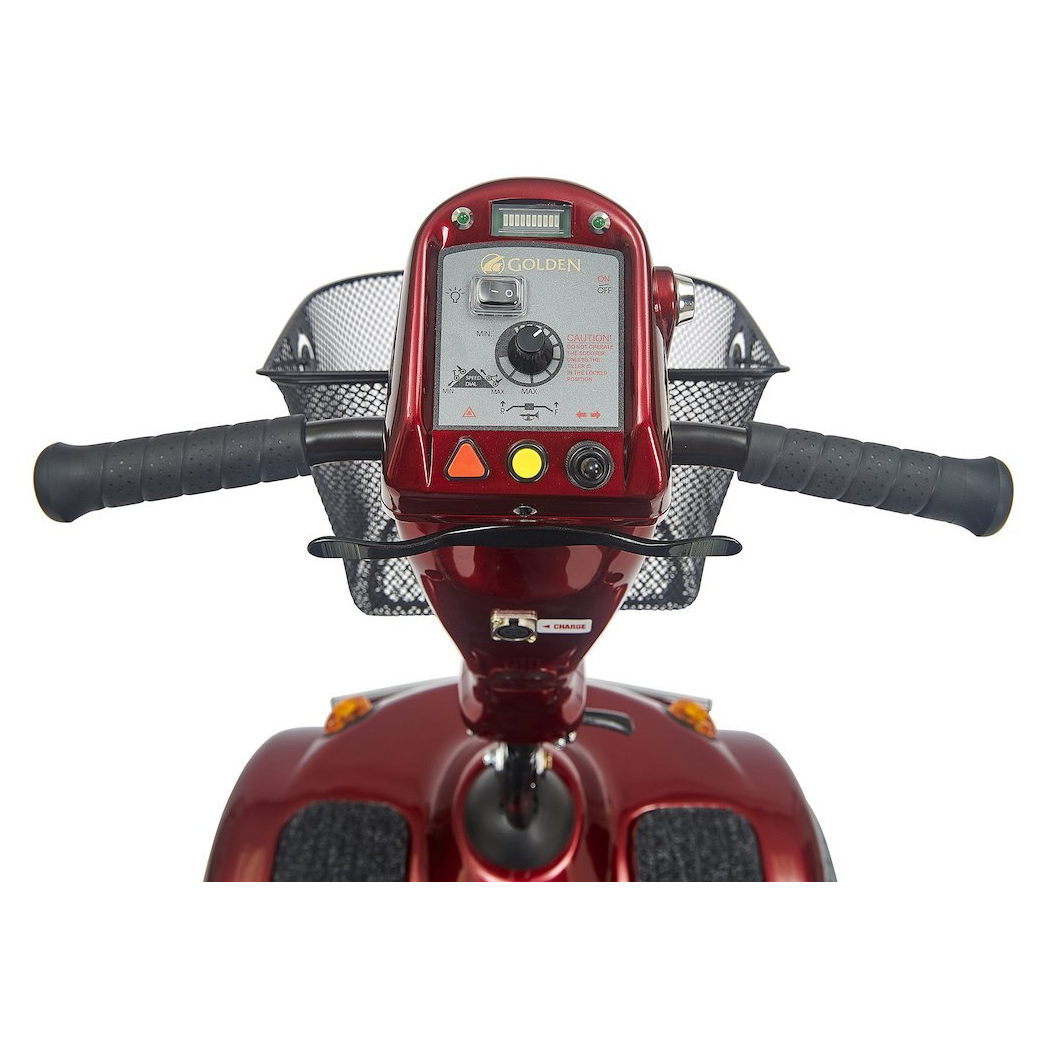 The Golden Avenger—a four-wheel, heavy-duty scooter—provides an impressive blend of rugged outdoor maneuverability while giving a smooth, comfortable ride over a variety of nature’s most challenging terrains. Durable and stylish, the Avenger includes a standard front basket, a full lighting package and an extra roomy seat with an adjustable headrest.